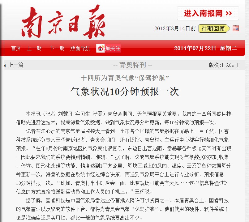 十四所为青奥气象“保驾护航”——气象状况10分钟预报一次