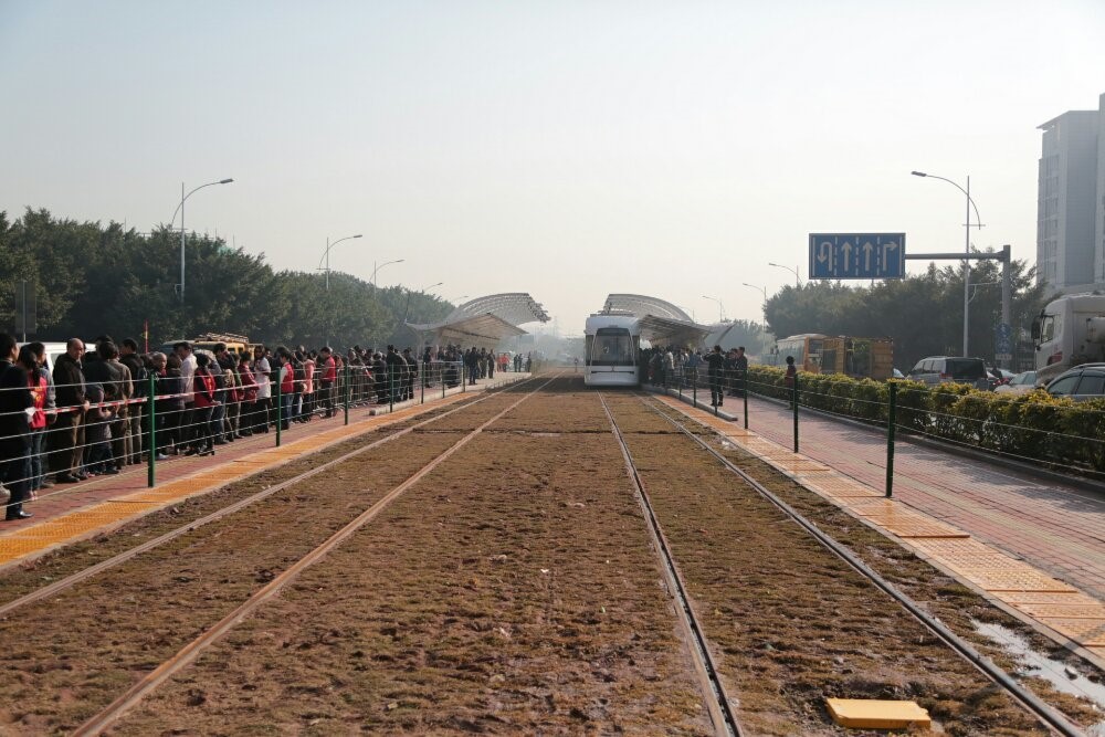 2014年12月31日上午9时随着一声响亮的鸣笛,海珠有轨电车试验段第一班车在广州塔站缓缓开出。纯白色车体、身披火红色木棉花图案的新型有轨电车与周边的珠江、建筑自然融为一体,自此成为了广州塔至万胜围沿线一道移动的风景。