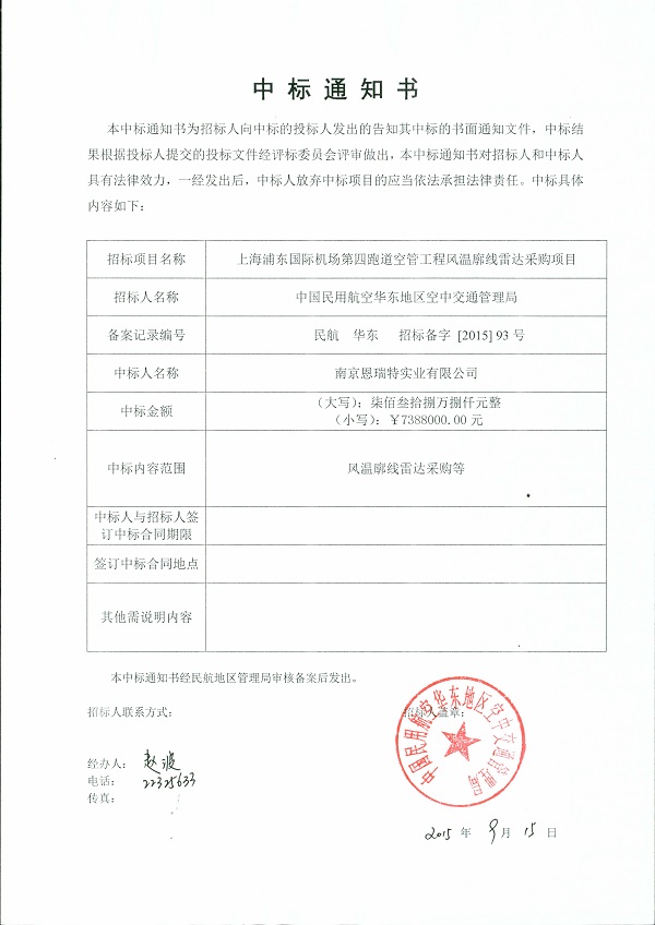 此次上海浦东国际机场风廓线雷达项目成功中标,不仅体现公司边界层风廓线雷达于民航市场具有强大竞争力,更是继公司空管二次雷达接入北京区管中心后再次占领民航高端市场。恩瑞特公司将再接再厉,深入了解民航用户需求,完善空管产品,提高售后服务品质,为我国空管装备国产化事业添砖加瓦!