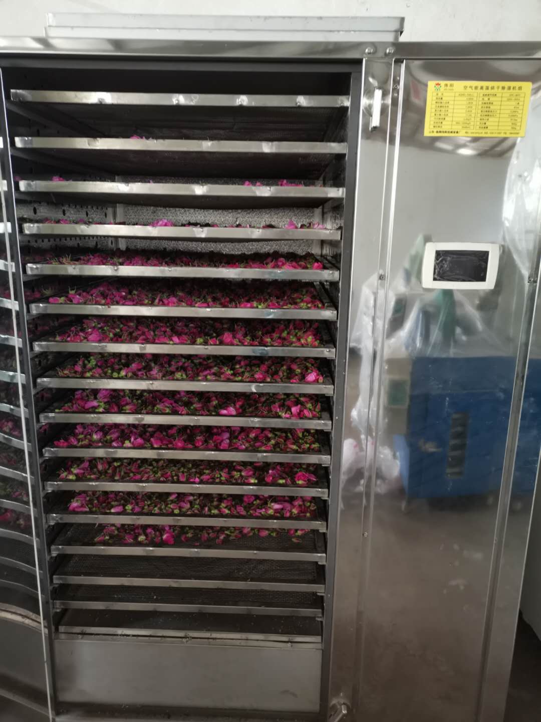 5 鲜花蕾的缩水烘干:这里使用的是空气能热泵烘干机加烘干室。装满花蕾的烘干车要轻轻推入烘干室,关闭烘干室升温,严格控制室内温度、依次顺序更换文火烘烤,定时转换风向,确保花蕾干湿均匀,色泽鲜艳。